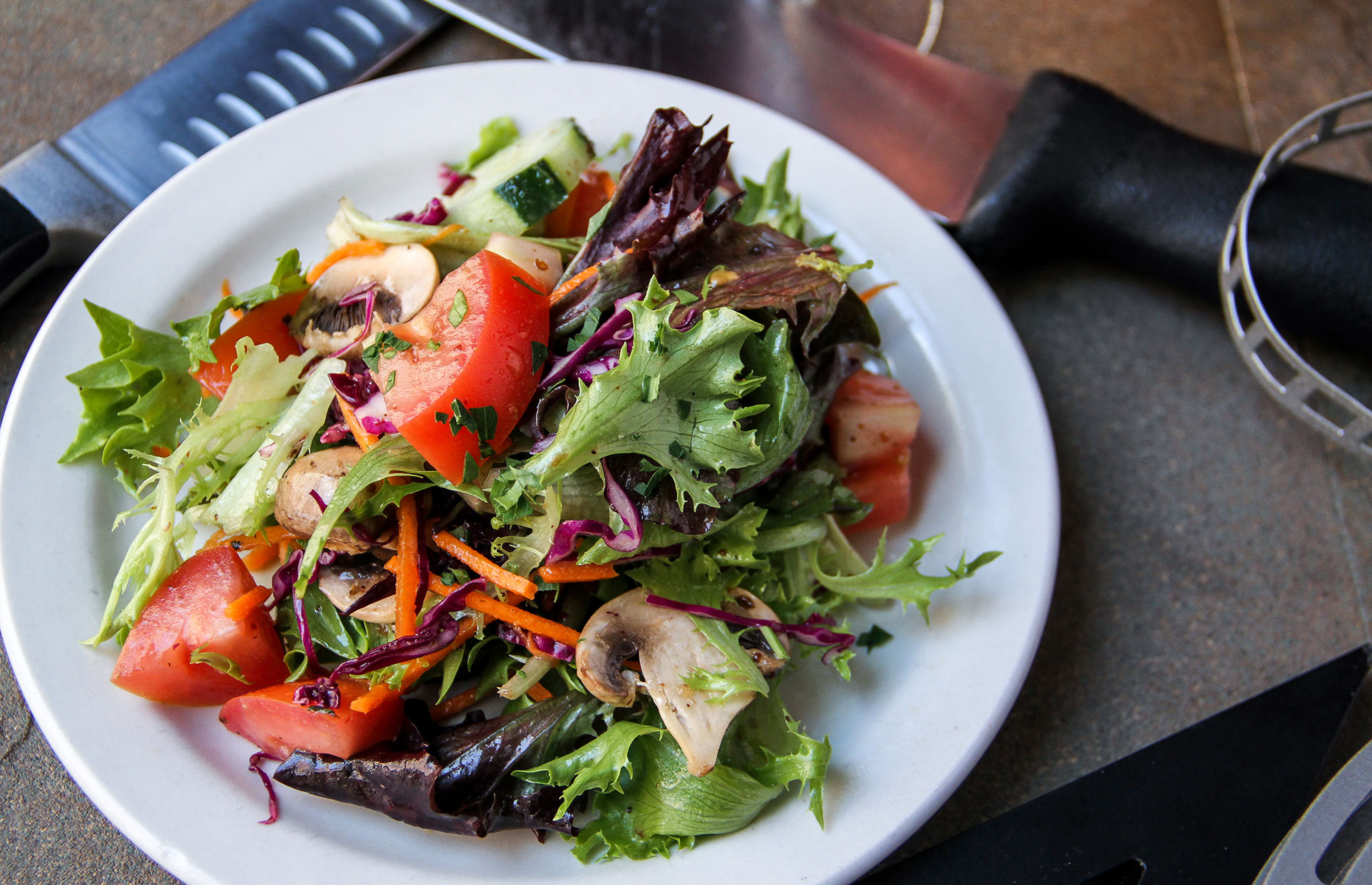 A fresh spring mix of greens topped with fresh Roma tomatoes, mushrooms, carrots, purple cabbage, and your choice of two homemade dressings: Buttermilk Ranch or Italian Vinaigrette.